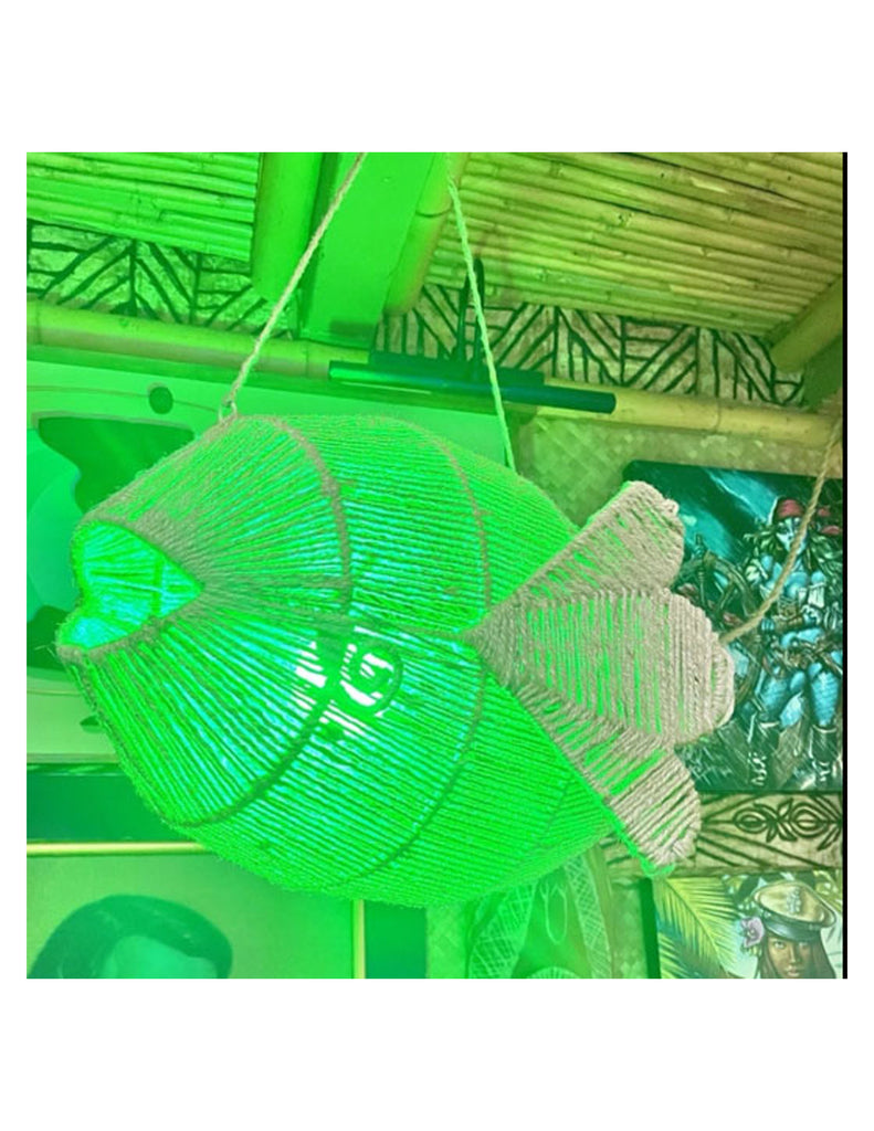 Aloha, this giant 24' pufferfish lamp was made from making a metal frame then wrapping it with twine. It has a green LED bulb and a 10' rope cord.